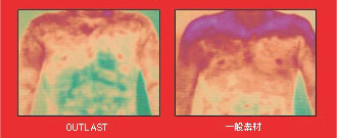 アウトラストを使用したウエアは、一般素材を使ったものよりも身体の表面温度が低くなっています。